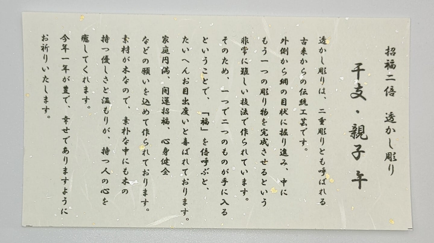 透かし彫りは、二重彫りとも呼ばれす。一つで二つのものが手に入ると言うことで「福」を倍呼ぶと、たいへんお目出度いと喜ばれております。