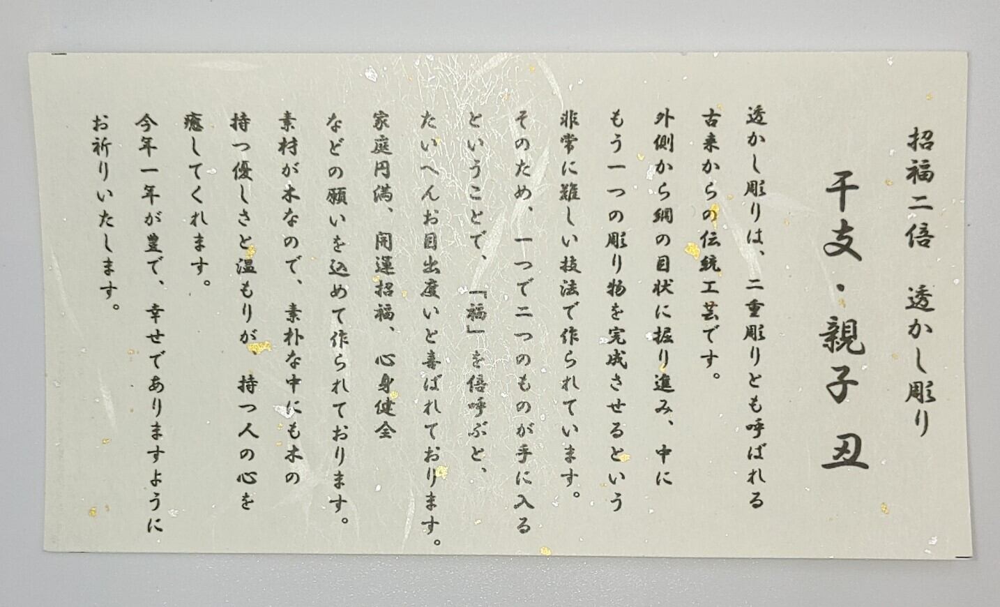 透かし彫りは、二重彫りとも呼ばれす。一つで二つのものが手に入ると言うことで「福」を倍呼ぶと、たいへんお目出度いと喜ばれております。