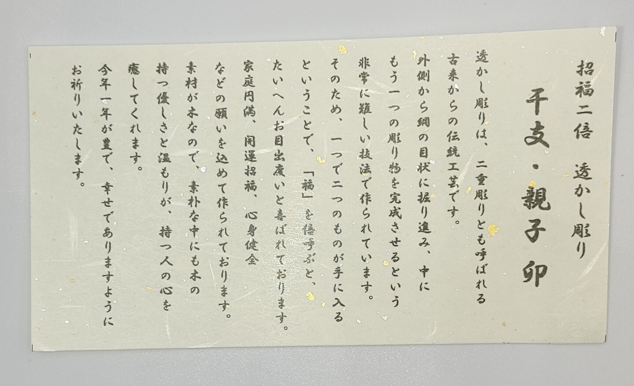 透かし彫りは、二重彫りとも呼ばれす。一つで二つのものが手に入ると言うことで「福」を倍呼ぶと、たいへんお目出度いと喜ばれております。