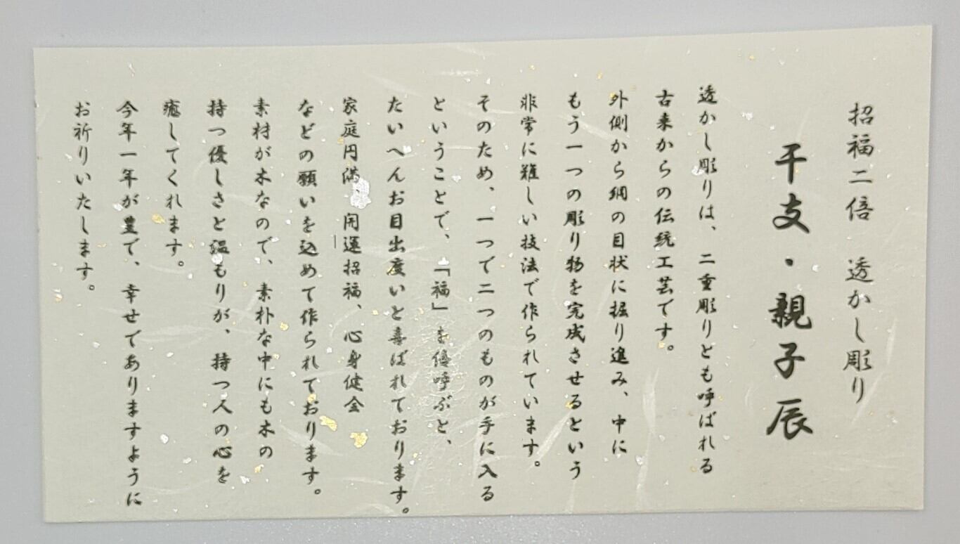 透かし彫りは、二重彫りとも呼ばれす。一つで二つのものが手に入ると言うことで「福」を倍呼ぶと、たいへんお目出度いと喜ばれております。