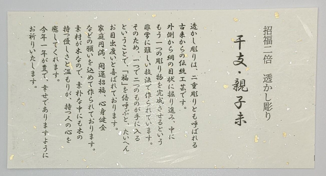 透かし彫りは、二重彫りとも呼ばれす。一つで二つのものが手に入ると言うことで「福」を倍呼ぶと、たいへんお目出度いと喜ばれております。